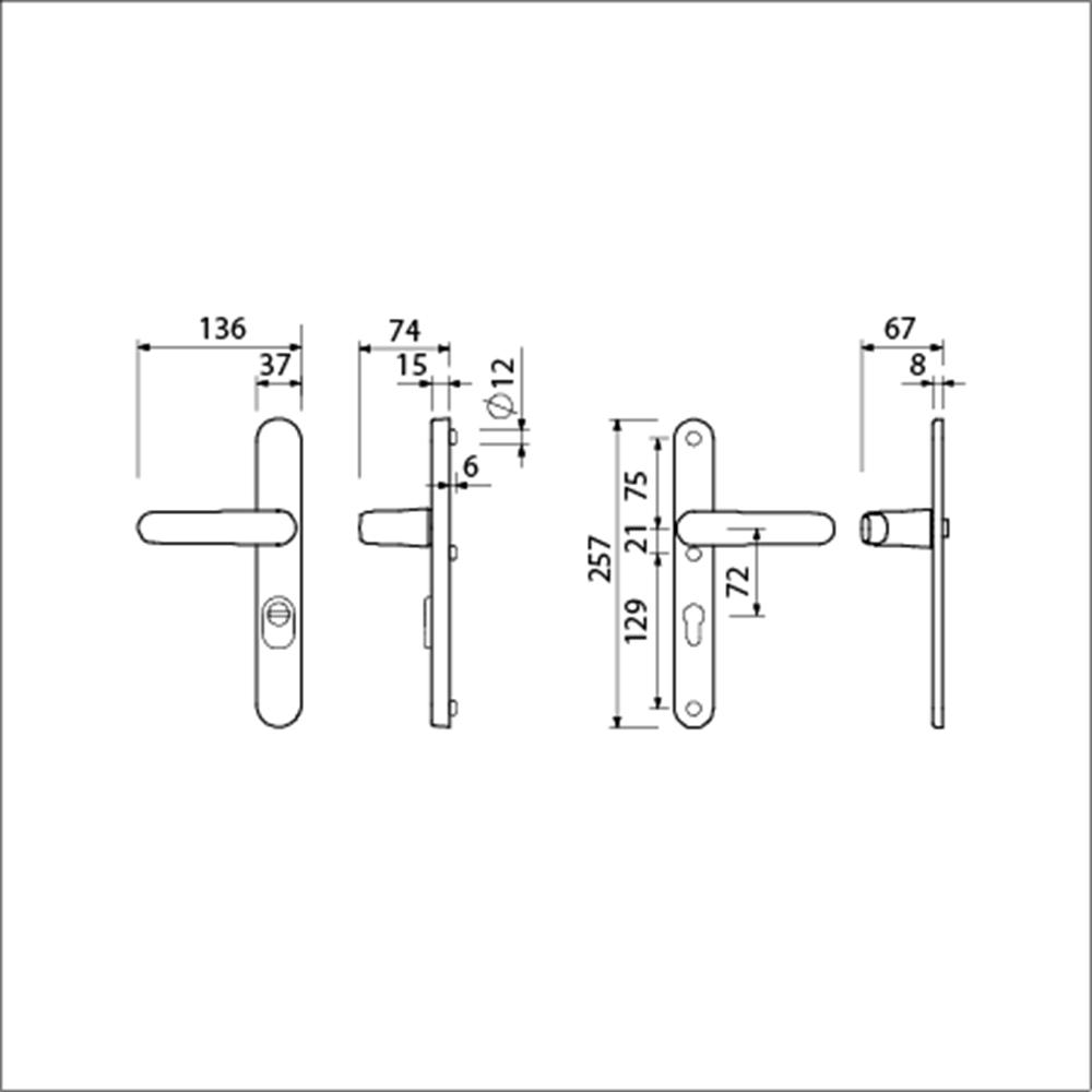 Buitenschild 15 mm dik en 37 mm breed met deurkruk 378 ROTA verend vastdraaibaar, binnenschild 8 mm dik en 32 mm breed met deurkruk 378 ROTA verend vastdraaibaar,