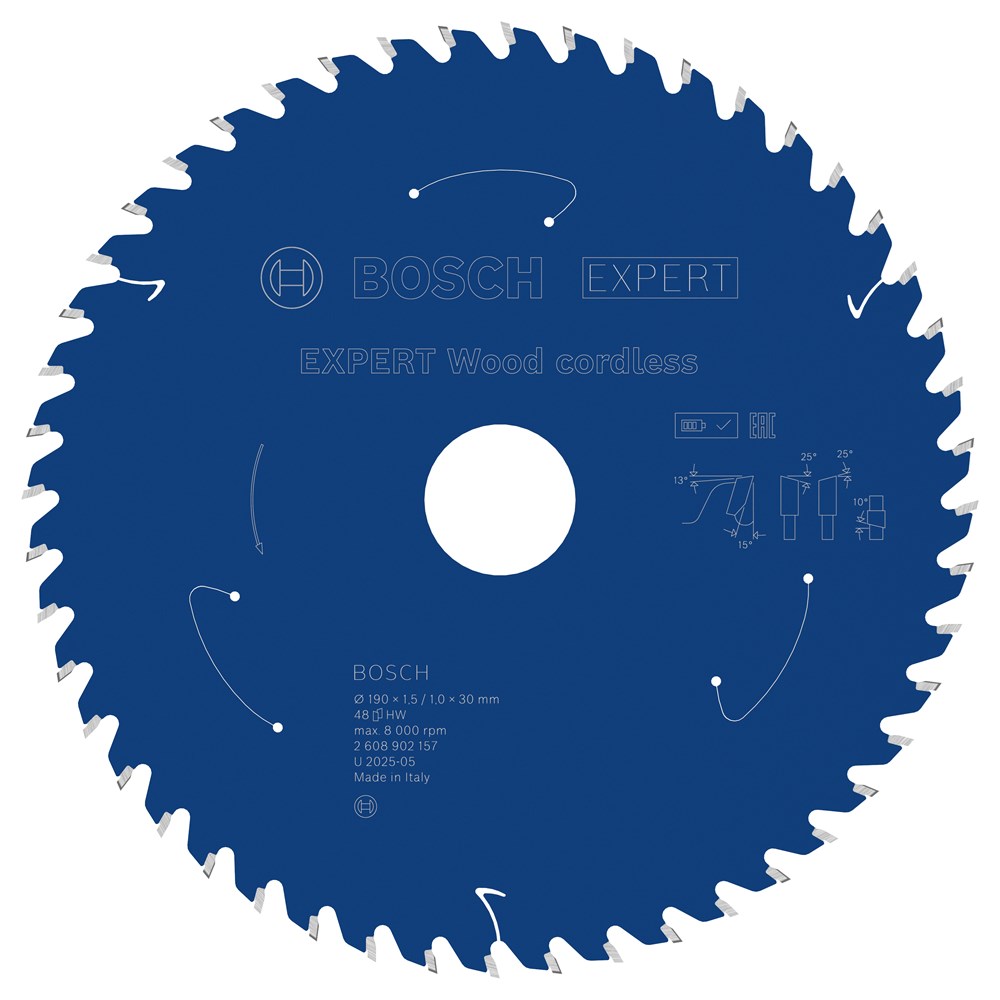 De EXPERT Wood cordless is voorzien van geslepen, fijne hardmetalen tanden die zijn gemaakt met Bosch Carbide Technology. Dit betekent dat het zuiver en nauwkeurig zaagt en langer meegaat dan elk ander cirkelzaagblad voor hout in ons assortiment. We hebben het een extra coating gegeven om warmteontwikkeling te voorkomen en het te beschermen tegen corrosie. De extra dunne kerf vermindert wrijving en zorgt ervoor dat je cirkelzaag minder stroom verbruikt, waardoor je langer kunt werken zonder de accu te hoeven opladen.