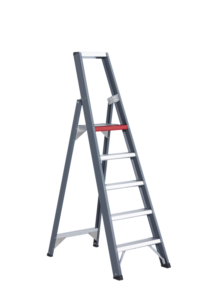 De grijze coating is niet alleen stijlvol. Het is bovendien vuilafstotend en geeft niet af aan je handen. Door de schetsschoren en grote voeten weet je zeker dat je stabiel staat. De steunbeugel is niet alleen veilig. Het bakje in de beugel geeft je ook een plek voor je gereedschap.