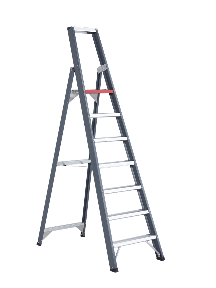 De grijze coating is niet alleen stijlvol. Het is bovendien vuilafstotend en geeft niet af aan je handen. Door de schetsschoren en grote voeten weet je zeker dat je stabiel staat. De steunbeugel is niet alleen veilig. Het bakje in de beugel geeft je ook een plek voor je gereedschap.