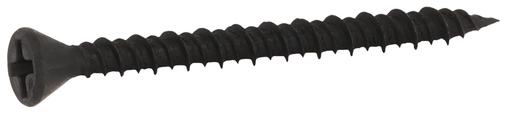 Type Fermacell. Zwart gefosfateerd, met hi-lo draad en 4 freesribben onder de kop, gehard, conische kop, met phillips kruis.