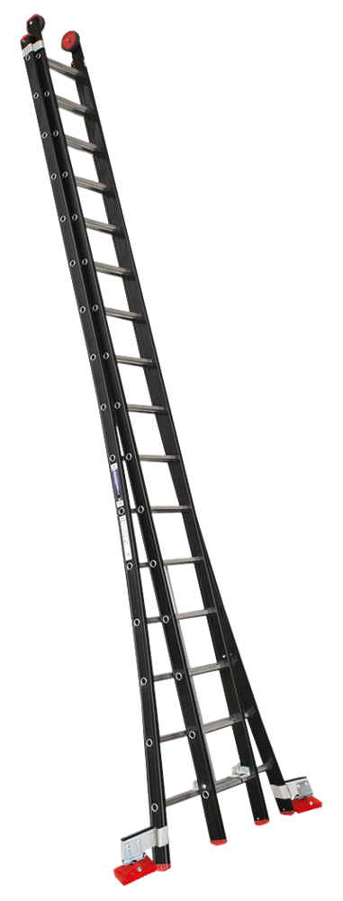 Model Magnus. 2-delige, professionele zwart polyester gecoate opsteekladder voorzien van uitgebogen bomen. De trapbomen bestaan uit een naadloos geëxtrudeerd aluminium kokerprofiel met aan de binnenzijde een smal gedeelte waartussen de sporten zijn ingeklemd. Met brede 28 mm sporten en tussen elke sport 250 mm afstand. De sport is aan de onderkant afgerond en aan de bovenkant vlakgeribd als een antislipbeveiliging.