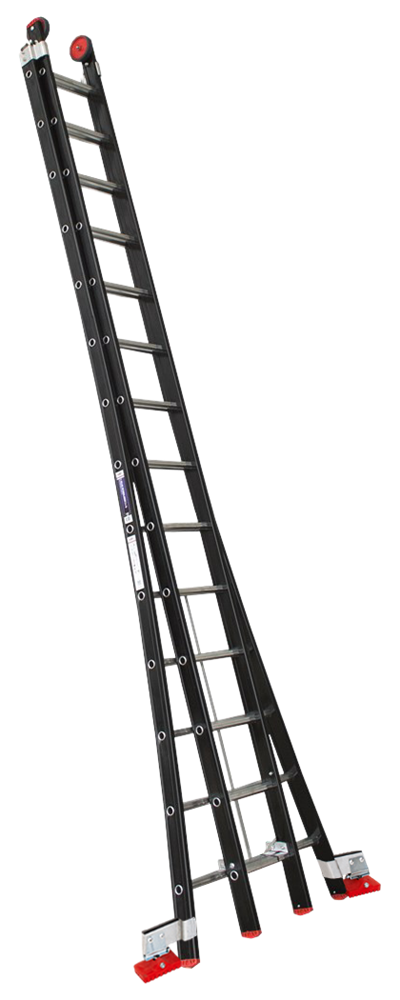 Model Magnus. 2-delige, professionele zwart polyester gecoate reformladder voorzien van uitgebogen bomen. De trapbomen bestaan uit een naadloos geëxtrudeerd aluminium kokerprofiel met aan de binnenzijde een smal gedeelte waartussen de sporten zijn ingeklemd. Met brede 28 mm sporten en tussen elke sport 250 mm afstand. De sport is aan de onderkant afgerond en aan de bovenkant vlakgeribd als een antislipbeveiliging.